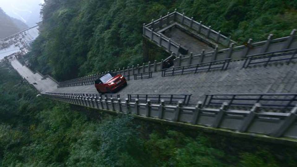 - Über 99 Serpentinen und 999 Stufen mit 45 Grad Steigung erreicht der Range Rover Sport als erstes Auto überhaupt die spektakuläre Felsformation „Tor zum Himmel“