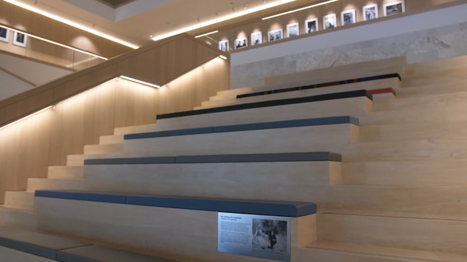 The atrium seating at the London museum has been re‑upholstered with 18 original materials used in Land Rovers from 1948 to 2018 for the Material Innovation installation.