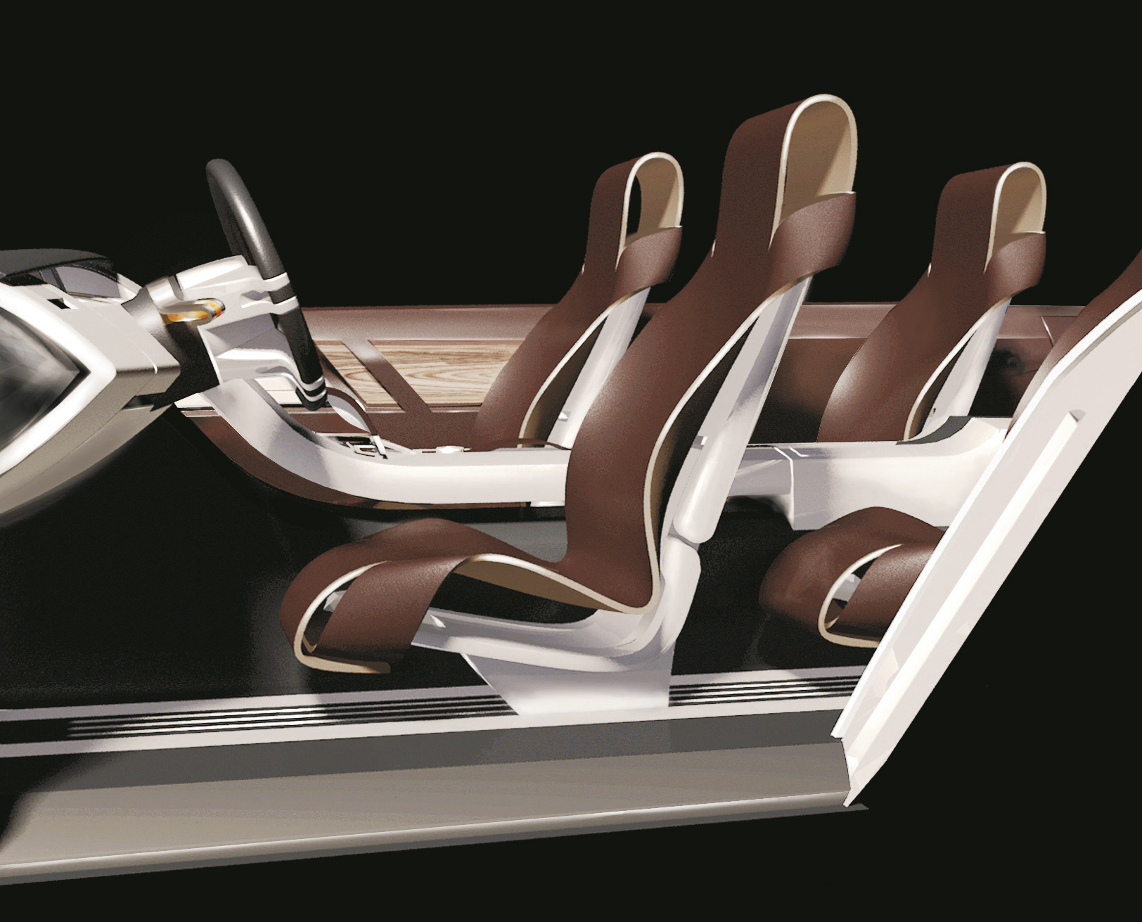 The interior features four distinctive individual seats. Their radical design is inspired by the concept of the Möbius strip, the deep brown saddle leather facings being cut from a single hide.